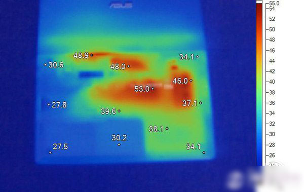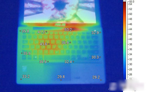 从图中可以看出华硕BU201在散热方面的表现还算良好,除了散热口和主要发热部位温度超过了50℃,其余部分的温度都维持在了50℃之下。在键盘面的中间部分,我们可以看到有些区域的温度超过了40℃,这对使用感受还是有一定的影响的。