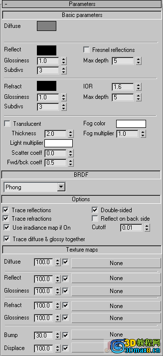 Diffuse – 这是该材质的漫射颜色。你可以在texture maps部分中的折射贴图栏中,使用一种贴图来覆盖它。