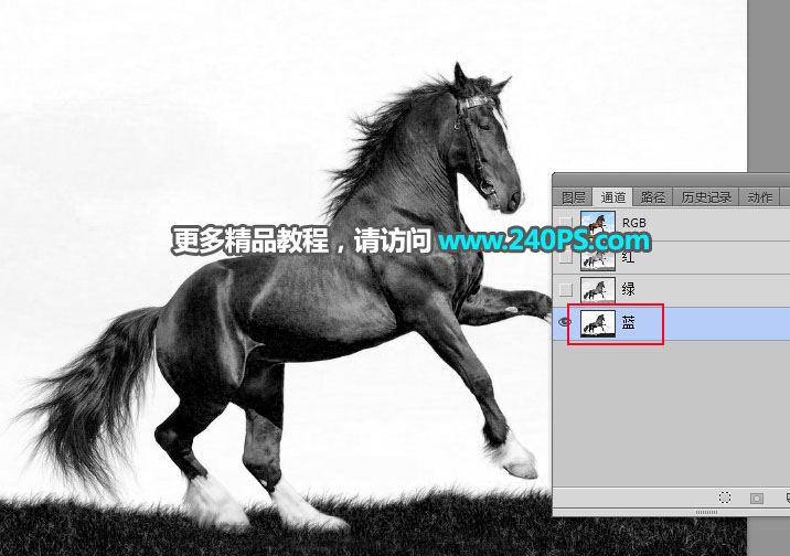 2、观察各通道,进入通道面板。 选择红通道:马的颜色和背景都比较灰。