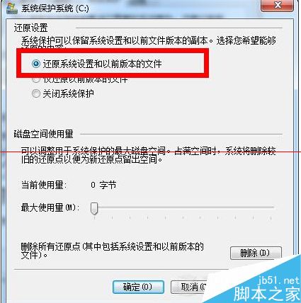 2)如果没有的话,点击配置,然后选择“还原系统设置和以前版本的文件”项,之后点击确定按钮保存退出。