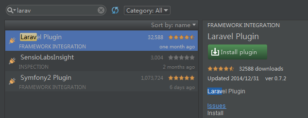为了进一步提升我们的Laravel体验,我们也可以安装Laravel插件. 在 Settings (Preferences) | Plugins, 点击 Browse repositories… 按钮并搜索Laravel. Install plugin 按钮会下载并安装插件到IDE.