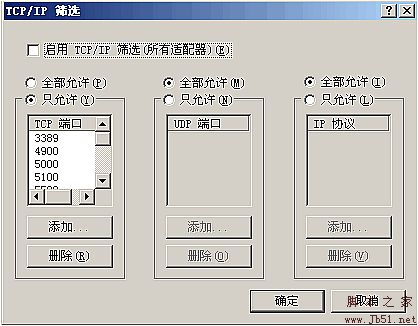 网上邻居--》右键--》属性--》本地连接--》常规--》Internet 协议(TCP/IP)-->属性--》高级--》选项--》TCP/IP筛选--》属性--》只允许 里面即可看到如下图。