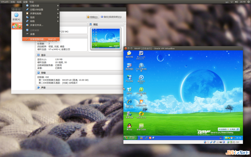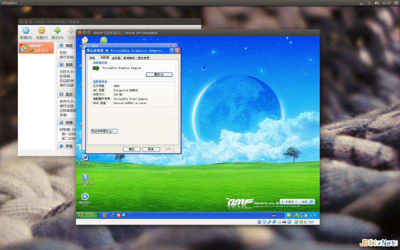 启动VirtualBox,新建虚拟机和安装操作系统的过程我就不多说了,图形界面很强大,一步一步执行准没错。安装完WinXP后,运行效果如下图: