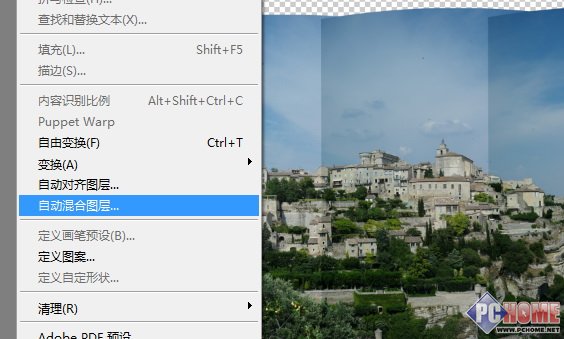 那么,现在的拼接画面中,还有一些因为镜头边缘暗角而带来的明暗变化,这该怎么处理呢?简单,同样是在“编辑”菜单中选择紧跟着的一项“自动混合图层”。