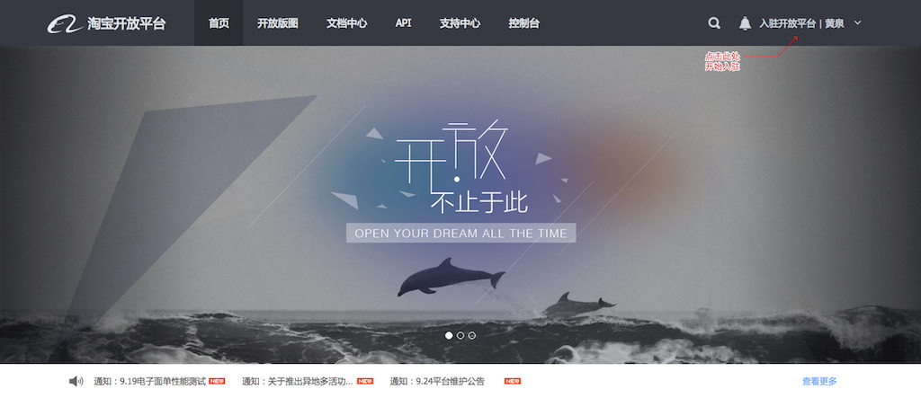 打开开放平台首页,使用淘宝账号登陆,
