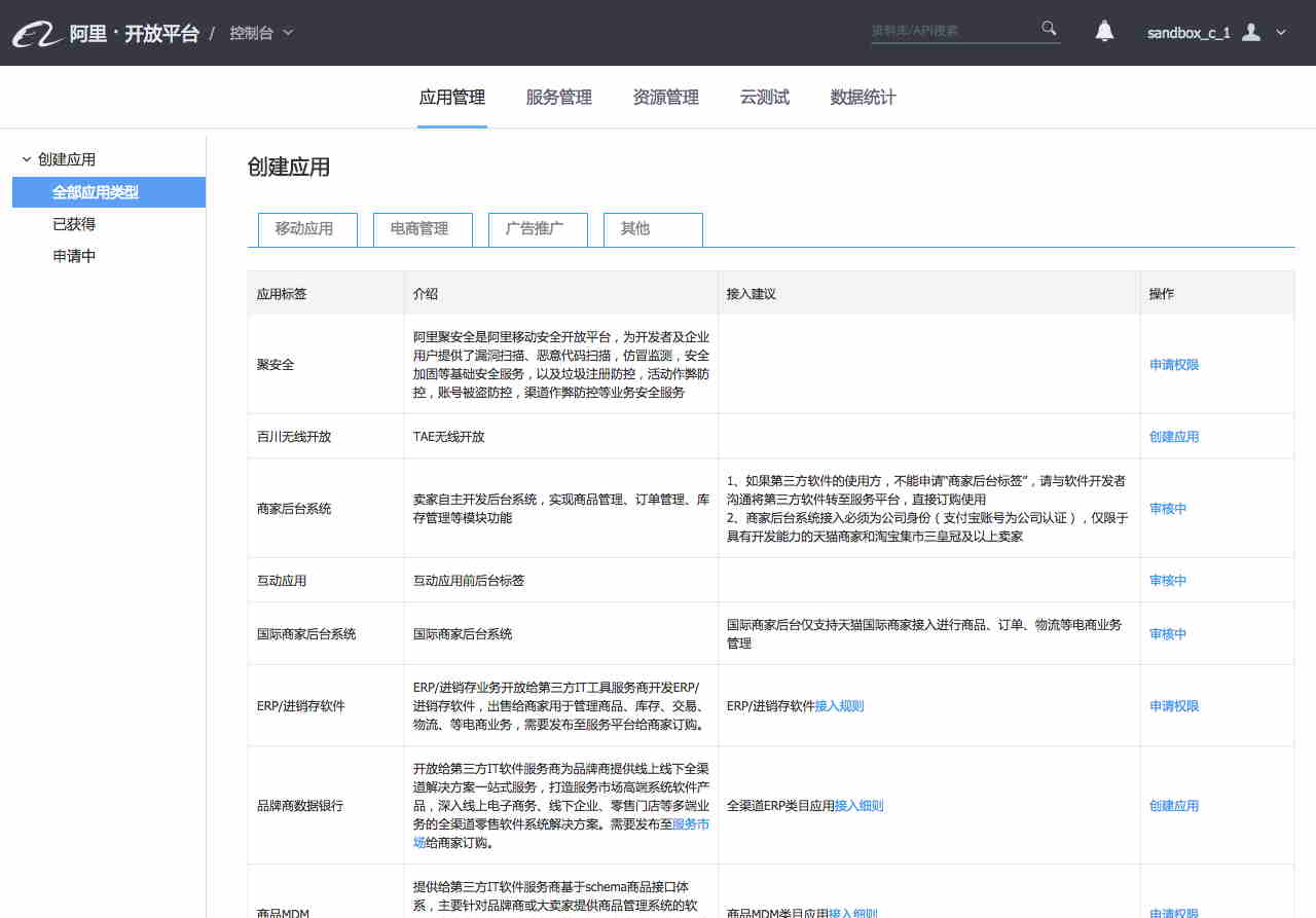 开放平台目前将所有开放的业务分为移动应用、电商管理、广告推广以及其他4类。