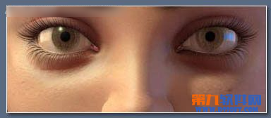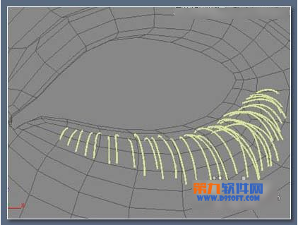现在简单的指定一个深褐色的材质给眼睫毛,在"opacity"槽放置一幅gradient map(渐变贴图),最后重复前面的步骤产生上面的眼睫毛,然后镜像给另一只眼。