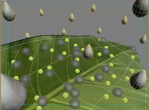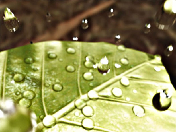 水滴:我复制了几次水滴,改变位置,进行缩放,使这些水滴有一种从天空中掉落的感觉。接下来我做了一点动画,让水滴正好从叶子旁边掉落,但是不要让水滴掉落太快,原因就是为了得到一个更好的动作效果。