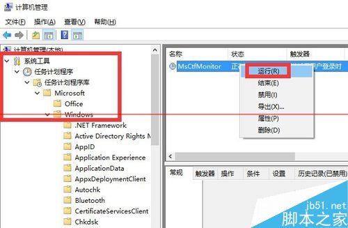 2、从打开的“计算机管理”界面中,依次展开“系统工具”-“任务计划程序”-“任务计划程序库”-“Microsoft”-“Windows”-“TextServicesFramework”菜单项,在窗口的右侧找到“MsCtrMonitor”项,右键点击MsCtrMonitor项,从其右键菜单中选择“进行”项。
