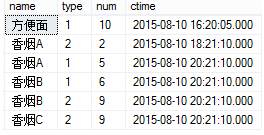 字段name是产品名称,字段type是销售类型,1表示售出,2表示退货,字段num是数量,字段ctime是操作时间。