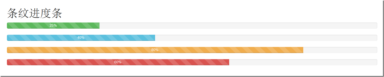 <h1>条纹进度条</h1> <div class="progress progress-striped"> <div class="progress-bar progress-bar-success" style="width:25%;" role="progressbar" aria-valuenow="25" aria-valuemin="0" aria-valuemax="100">25%</div> </div> <div class="progress progress-striped"> <div class="progress-bar progress-bar-info" style="width:40%;" role="progressbar" aria-valuenow="40" aria-valuemax="100" aria-valuemin="0">40%</div> </div> <div class="progress progress-striped"> <div class="progress-bar progress-bar-warning" style="width:80%;" role="progressbar" aria-valuenow="25" aria-valuemin="0" aria-valuemax="100">80%</div> </div> <div class="progress progress-striped"> <div class="progress-bar progress-bar-danger" style="width:60%;" role="progressbar" aria-valuenow="40" aria-valuemax="100" aria-valuemin="0">60%</div> </div>
