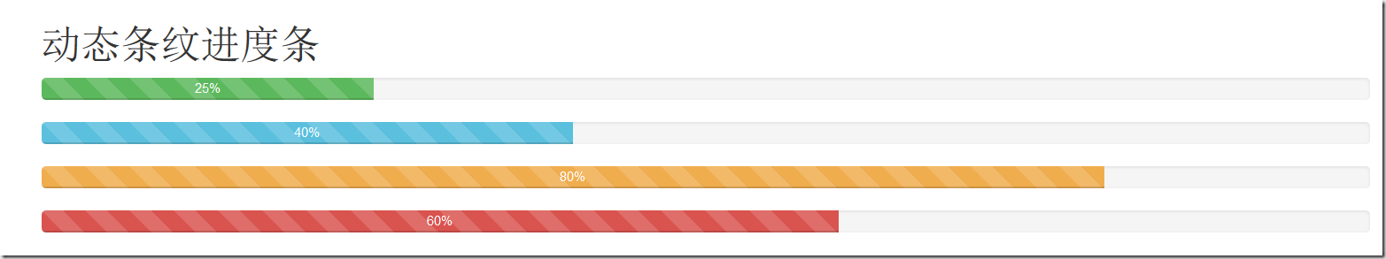 <h1>动态条纹进度条</h1> <div class="progress progress-striped active"> <div class="progress-bar progress-bar-success" style="width:25%;" role="progressbar" aria-valuenow="25" aria-valuemin="0" aria-valuemax="100">25%</div> </div> <div class="progress progress-striped active"> <div class="progress-bar progress-bar-info" style="width:40%;" role="progressbar" aria-valuenow="40" aria-valuemax="100" aria-valuemin="0">40%</div> </div> <div class="progress progress-striped active"> <div class="progress-bar progress-bar-warning" style="width:80%;" role="progressbar" aria-valuenow="25" aria-valuemin="0" aria-valuemax="100">80%</div> </div> <div class="progress progress-striped active"> <div class="progress-bar progress-bar-danger" style="width:60%;" role="progressbar" aria-valuenow="40" aria-valuemax="100" aria-valuemin="0">60%</div> </div>