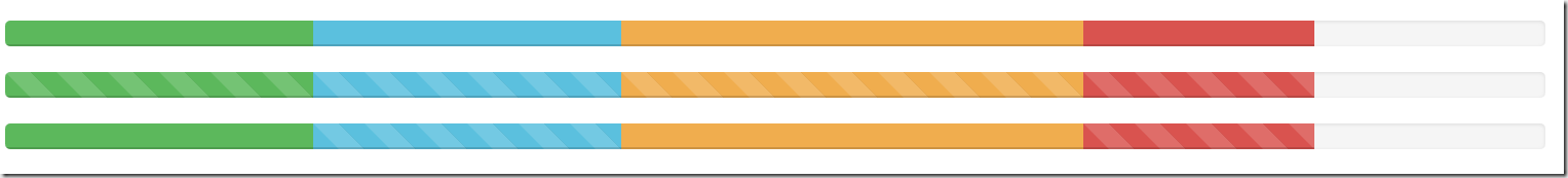 <div class="progress"> <div class="progress-bar progress-bar-success" style="width:20%"></div> <div class="progress-bar progress-bar-info" style="width:20%"></div> <div class="progress-bar progress-bar-warning" style="width:30%"></div> <div class="progress-bar progress-bar-danger" style="width:15%"></div> </div> <div class="progress"> <div class="progress-bar progress-bar-success progress-bar-striped" style="width:20%"></div> <div class="progress-bar progress-bar-info progress-bar-striped" style="width:20%"></div> <div class="progress-bar progress-bar-striped progress-bar-warning" style="width:30%"></div> <div class="progress-bar progress-bar-danger progress-bar-striped" style="width:15%"></div> </div> <div class="progress"> <div class="progress-bar progress-bar-success" style="width:20%"></div> <div class="progress-bar progress-bar-info progress-bar-striped" style="width:20%"></div> <div class="progress-bar progress-bar-warning" style="width:30%"></div> <div class="progress-bar progress-bar-danger progress-bar-striped" style="width:15%"></div> </div>