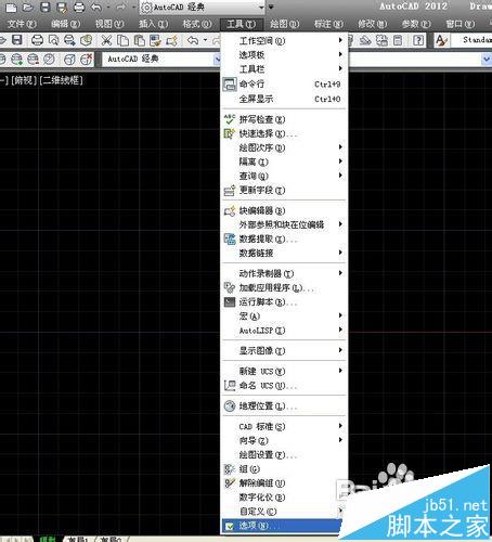 1、打开CAd界面,在菜单栏里找到工具,在工具下拉列表中找到选项,单击