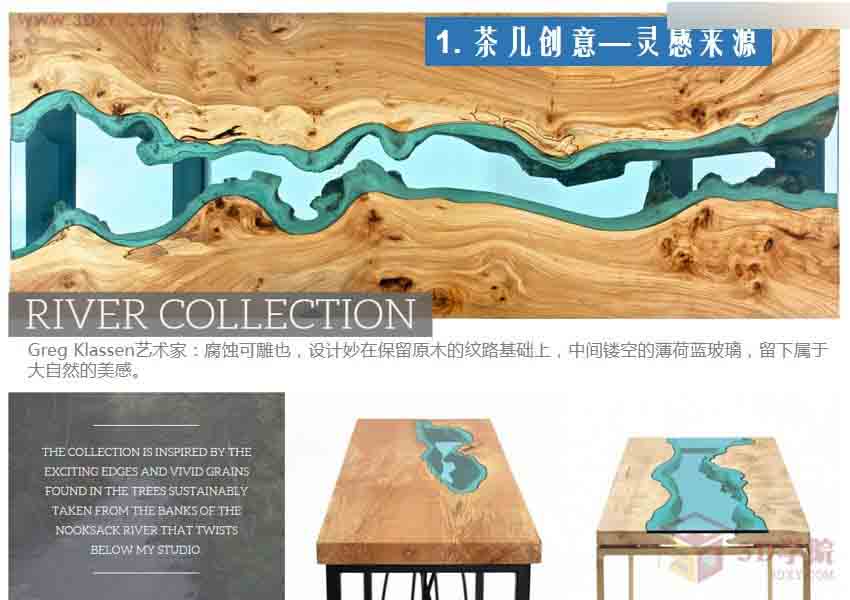 一块木材因为腐蚀而分成了两个个体,艺术家便利用玻璃使其重新合一,不改变中间自然形成的裂痕,留下属于大自然的美感。设计妙在保留原木的纹路,在中间镂空的地方覆盖一块薄荷蓝的玻璃,当你看着它时,仿佛就在高空俯瞰地形图一般。