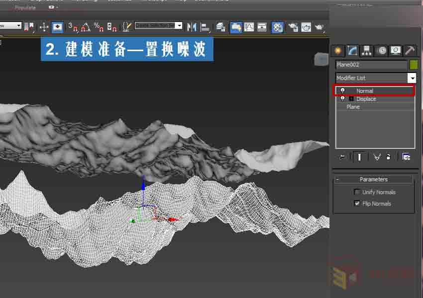 第二步:添加置换修改器(Displace)。然后在贴图上添加噪波(Noise)程序贴图。