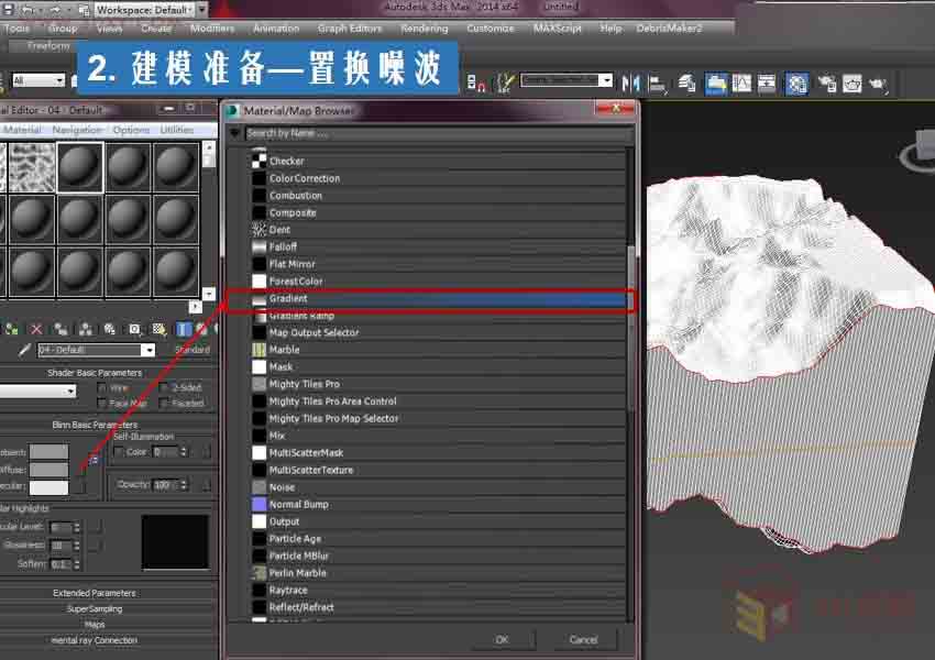 第十三步:挤出完成后,我们在顶视图将上面的海洋地形部分赋予我们之前的渐变材质,添加贴图坐标修改器。