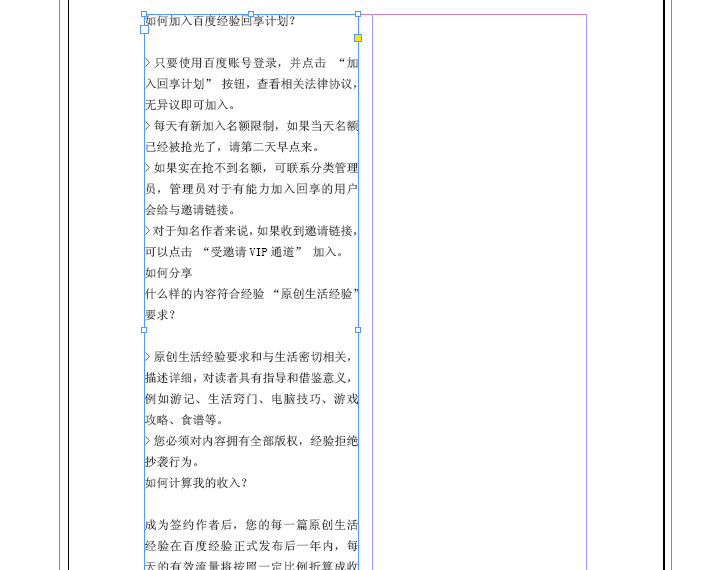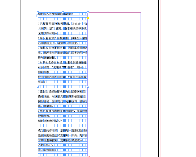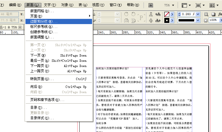 4、大家应该发现,文字是按着版心,边距分栏来排列的,所以上一课版心和分栏的设置很重要,这里就用到了,当然要是不分栏的话文字就会按照整张排列下来,我们在版面里找到编辑和分栏进行设置,栏数变成1,进行编排。