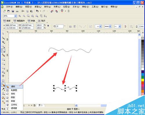 3、选择”交互式调和工具“ 从长波浪线往短波浪线拖拽,如图,