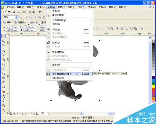6、接着“排列”—“取消群组”,如图,接着,再次”排列“——”将轮廓转换为对象“如图,