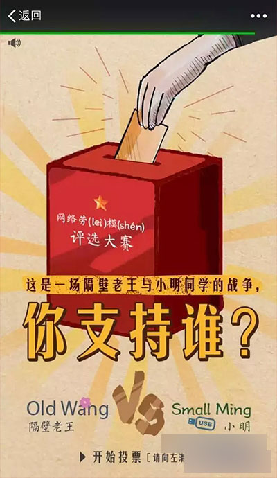我再举一个例子,五一劳动节的时候,我们做了一个H5的小游戏,叫做"互联网劳模评选",就是在"隔壁老王"、"小明同学"、"广场舞大妈"、"卖面膜的"等候选人中评选。其实暴风自己的流量足够,但是我们为了保险,想请几个大号帮我们转发一下,后来几个大号报价都是几万几万的,我就问负责这个事的同事,如果是花五万,你能保证1000个转发吗?答案是保证不了。