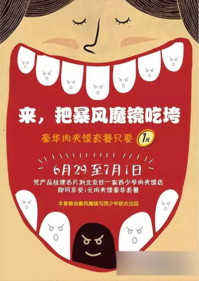 那好,既然我们需要很多互联网的产品经理,那我们就找到互联网企业集中的地方,去找那些产品经理就好了。最后,我们的计划是这样的,暴风魔镜跟西少爷肉夹馍在中关村、望京的店联合推出产品经理肉夹馍套餐,只要凭产品经理名片就可以1元吃套餐。当有了这些名片后,HR就可以筛选并用高薪和股权挖人了。