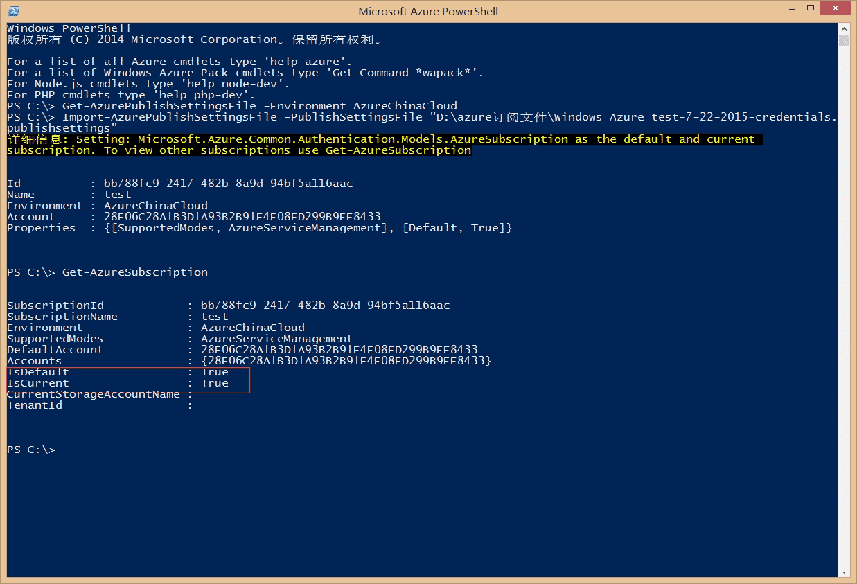 6.目前只有一个Azure账户,为True状态,如图: