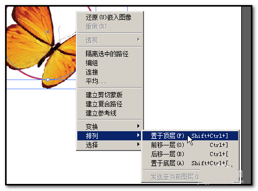 5、选中正圆,右击,弹出菜单点:排列--置于顶层;鼠标放其它空白位置点下,取消选择,可以看到正圆在图片之上了。
