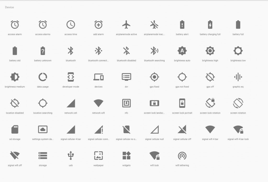 在现代的数字设计当中,字符图标在古老的字符系统上有了新的发展。现在的字符图标同样包含了字母、数字和图形,它们中所涵盖的内容更加丰富。这样一来,现在提及字符图标,我们通常不会将它们视为文字,而是图标。下面是Material Design 的字符图标集: