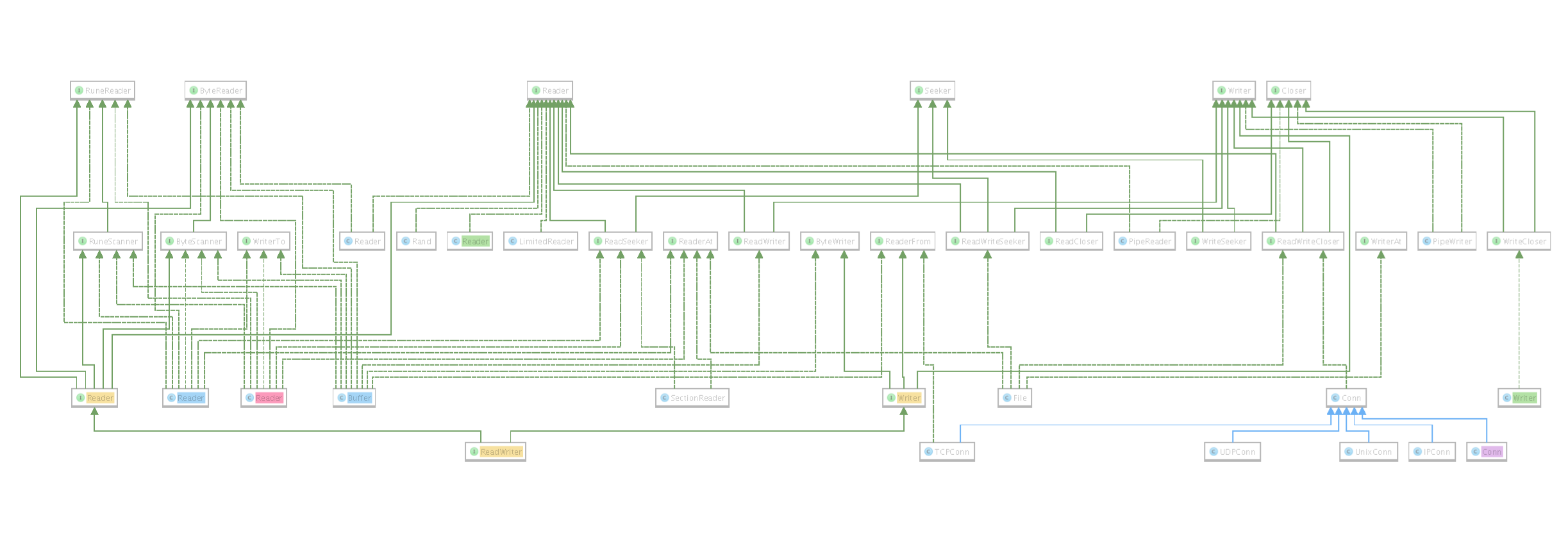 当然,Go语言中并没有Java中那样的继承关系,而是基于duck type形式实现,我用下图尝试展示Go io接口的继承关系。