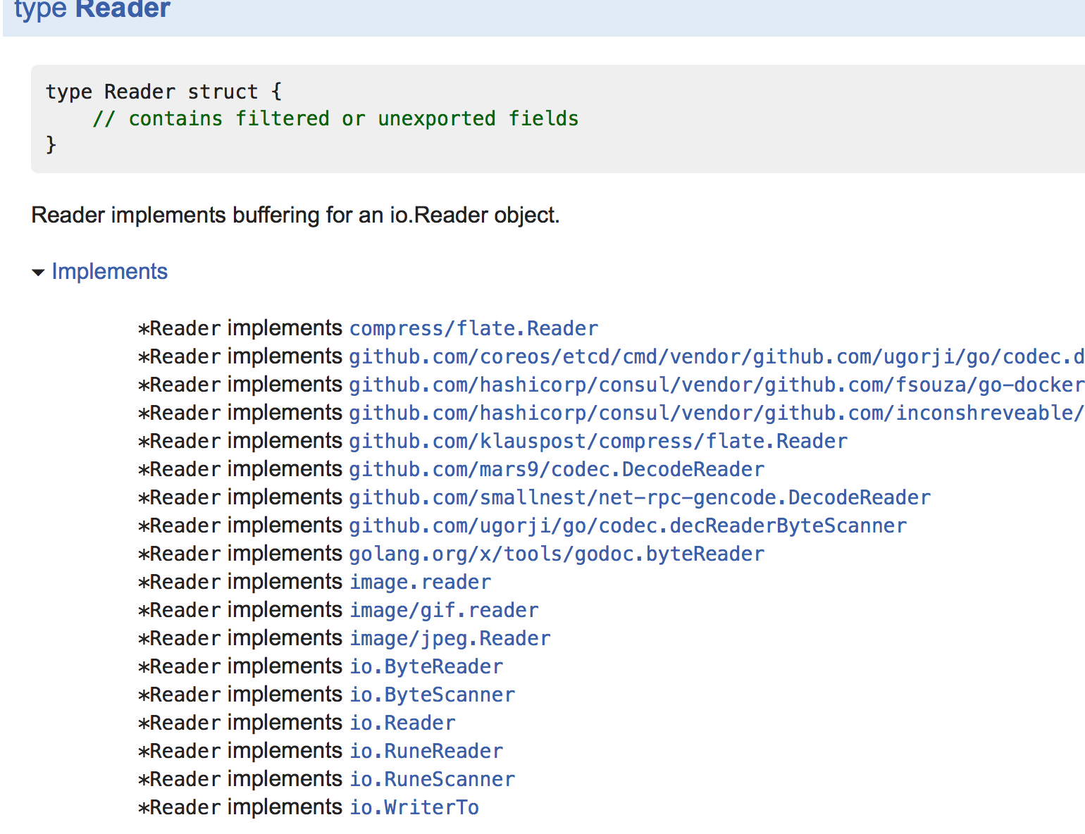 也许对这两个接口和相关的一些接口很熟悉了,但是你脑海里确很难形成一个对io接口的继承关系整天的概貌,原因在于godoc缺省并没有像javadoc一样显示官方库继承关系,这导致了我们对io接口的继承关系记忆不深,在使用的时候还经常需要翻文档加深记忆。