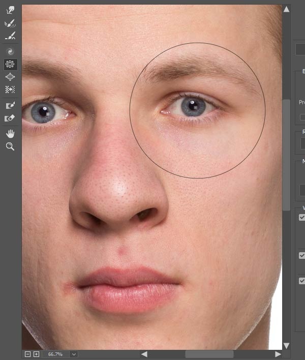 7、老年人脸颊的肉会往下坠,与鼻子形成皱纹。所以这里选择向前变形工具,将眼睛下的区域,轻微往下拉。
