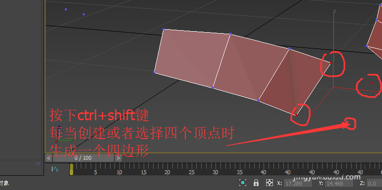 9、按下ctrl+shift键,单击,可以选择一个顶点或者在空白位置创建一个顶点。每当创建/选择四个顶点时,就会生成一个四边形。