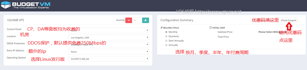 5、按上图选择你想要的机房、是否购买额外IP、选择系统等,可以按图中注释进行选择。优惠码:ZHANVPX3 全场VPS 8折终身优惠,仅限月付。填写后点击"Check Coupon"。