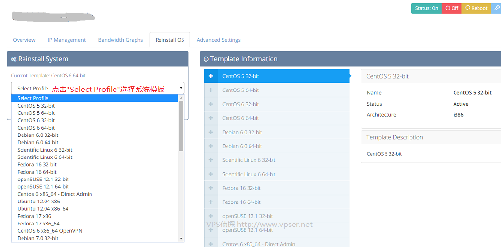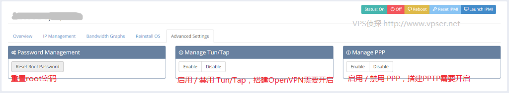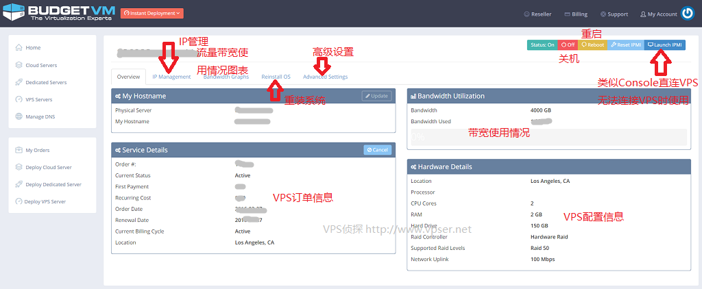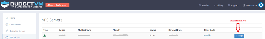 点击"VPS Servers"就会进入VPS列表,点击对应VPS后面的"Manage"就会进入该VPS管理界面