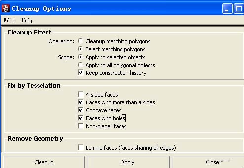 在弹出来的cleanup options窗口中,第一项cleanup effect---operation中,第一项表示发现多变面错面并将其连接成四边面或正确的面,第二项表示选择多变面或错误的面。