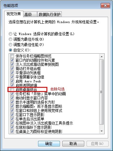怎样设置呢?只要在桌面上的计算机图标上面“右键”,选择“属性”,在弹出的窗口选择“高级系统设置”,打开的系统属性窗口里面选择“高级——性能——设置”,弹出性能选项窗口,在自定义中勾去“启用桌面组合”就可以了。