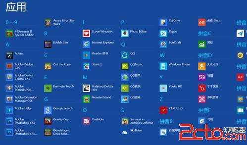 在这里可以通过字母排列来找到相应的应用,好在Win8应用的排序都默认很靠前,桌面程序都在后面的位置。找到之后使用上面一样的方法来卸载应用就可以了。