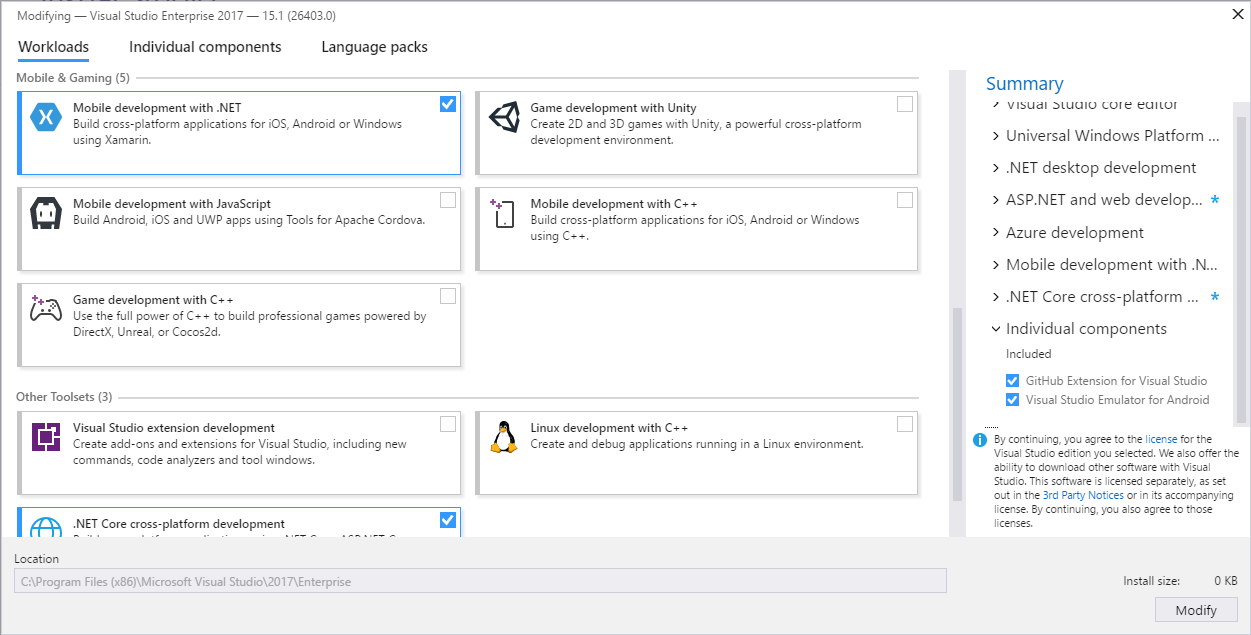 Visual Studio团队提升了Visual Studio 2017这个版本的整体安装体验。新的安装过程更加直观并且触摸友好,最重要的是我们通过仅选择所需的工具,就能实现较低的磁盘占用。我们可以选择最适合我们需求的功能,例如移动开发只需要包含.NET,UWP或 .NET Core就可以。只安装所需的组件,能将下载和最终安装尺寸保持在最小状态。你可以比以前更快地入手,另外需要确保你安装的部分,只包含你最开始时所需的功能。