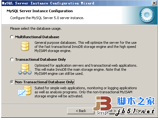 选择MySQL数据库默认存储方式:Non-Trans Only (MYISAM)
