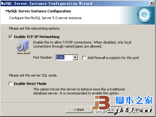 设定MySQL网络参数,注意:不要勾选启用Strict Mode!那个Addfirewall的选项仅在需要外连MySQL的时候勾选上,也就是说给防火墙加个出入站的策略。
