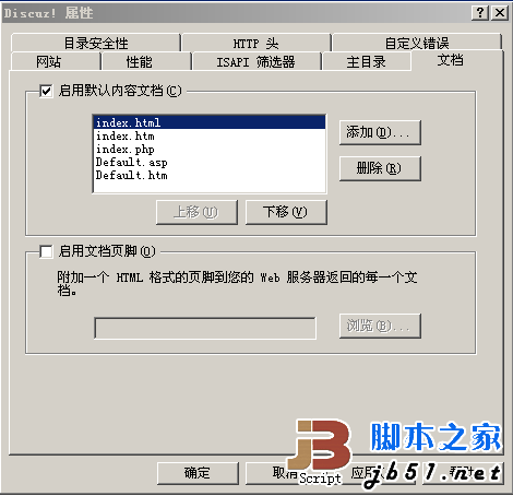 单击“文档”页签,在默认内容文档中添加index.htm、index.html、index.php三个文件,并将所有默认文档排序,顺序按照下图所示。完成后,单击“确定”,关闭站点属性配置窗口,回到IIS管理器主界面。