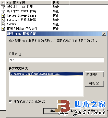 在如下图所示的“新建WEB服务扩展”对话框中,“扩展名”填写PHP,“文件”选择X:\Server_Core\PHP\php5isapi.dll,并设置该PHP扩展默认为允许。