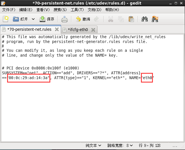 1、修改文件/etc/udev/rules.d/70-persistent-net.rules和/etc/sysconfig/network-scripts/ifcfg-eth0,使得两个文件中的设备名和MAC地址相对应