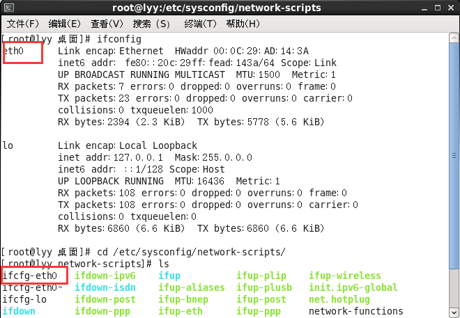 [root@lyy 桌面]# ifconfig //查看当前网卡信息 [root@lyy 桌面]# cd /etc/sysconfig/network-scripts //进入网卡配置文件目录 [root@lyy network-scripts]# ls //查看网卡配置文件中的网卡信息