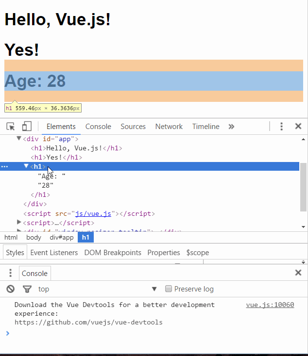 为了再次验证这一点,可以在Chrome控制台更改age属性,使得表达式age >= 25的值为false,可以看到<h1>Age: 28</h1>元素被删除了。