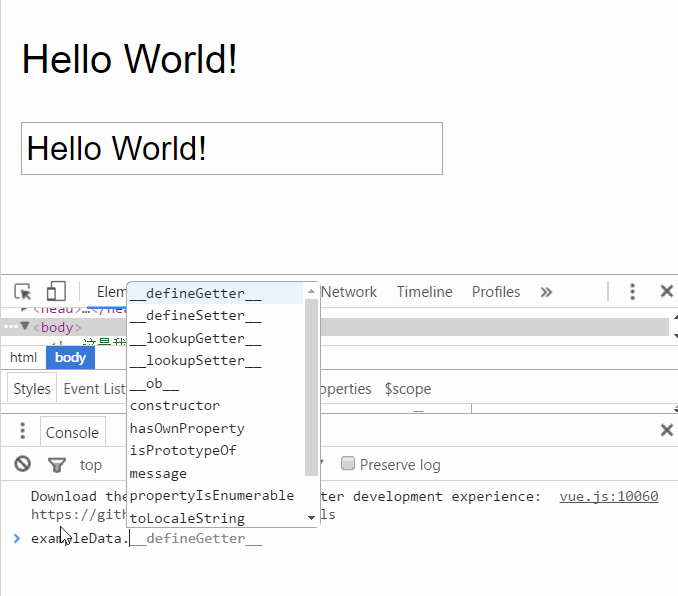反过来,如果改变message的值,文本框的值也会被更新,我们可以在Chrome控制台进行尝试。