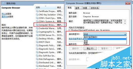 1、在客户机中按照上面同样的方法,将工作组中其他电脑的“Computer Browser服务”的启动类型设置为“手动”或“禁用”。