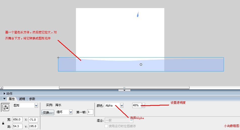 第三步:画完水滴后,点海水图层的第一帧,在舞台上画一个蓝色长方体无边框,设置它的大小,并把它转换成图形元件,设置透明度。为了让海水透明不破坏水滴下来的效果,为了让海水有流动效果,将海水图形稍微往右拉点,为的是后面,见下图: