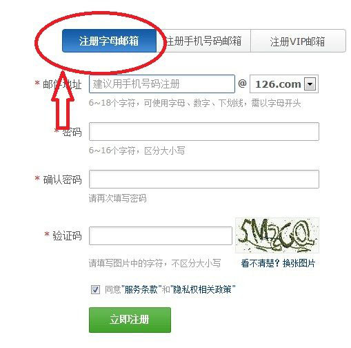 2.在出现的页面中一定要点击“注册字母邮箱”,接下来填写邮箱地址及密码就可以了,最后点击“立即注册”如图: